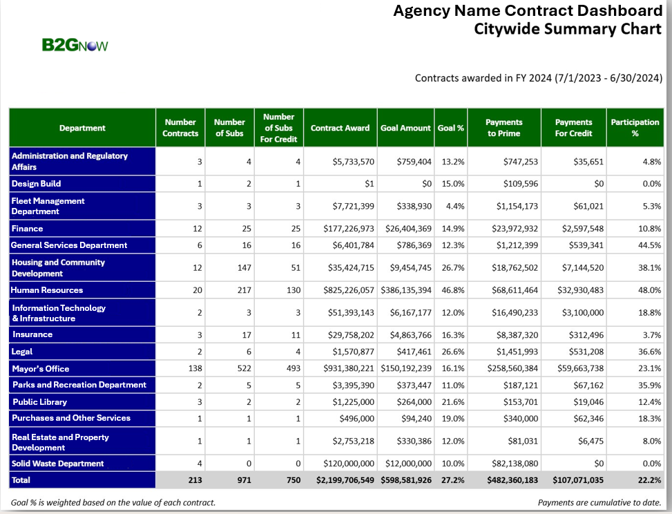 The Public Dashboards Module allows organizations to share high-level program metrics and achievements with their vendor community and external stakeholders through a public portal. Similar to the B2Gnow platform’s internal dashboards, this module provides clear, accessible reporting with full control over what data is shared and who can access it.