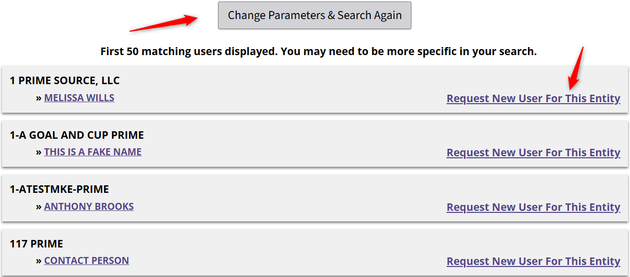 4. If you see your business listed in the search results but your name is not listed as a user, click the Request New User For This Entity link to complete Request New User form. Click the Submit button to send the message to Customer Support.