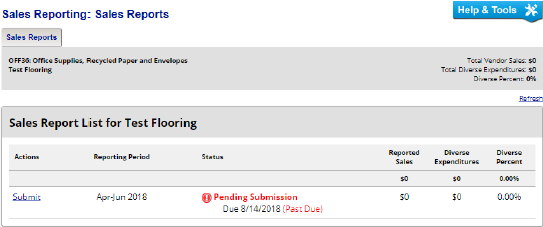 Once you have located the sales contract you wish to work on, you will be directed to your list of sales reporting periods you need to report on. To get into a specific sales reporting period, in the left actions column, simply click Submit.