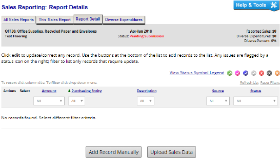 The Report Detail tab allows users to manually enter individual sales records, a method well-suited for smaller data sets or users who prefer direct input. After selecting the appropriate reporting period, users can click Add Record Manually to access a data entry screen that includes contract and reporting information, along with dynamically generated fields based on the assigned data template.