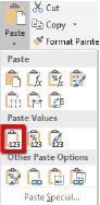 Make sure when you’re pasting your data to Paste Values Only which will strip off any additional formatting. In the top left corner of excel will be a Paste button with a dropdown, click that and then the first option in Paste Values section is the option we want.