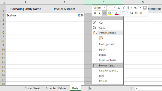 Make sure all your data is in its proper format before submission. (e.g. Invoice Date is mm/dd/yyyy). To apply the format to the whole column, click the C column header for Invoice Date. Then right click the highlighted column and choose Format Cells… In the left category selection, choose Date, then find an accepted date format.