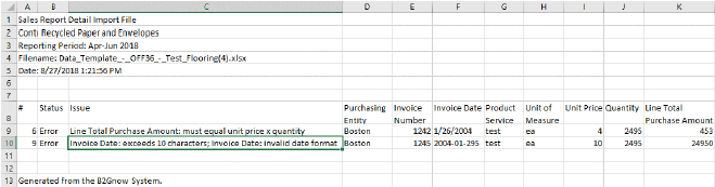 We also know for our other error the Invoice Date is not only formatted incorrectly but exceeds the 10 character limit. We must now return to our previously uploaded file, make the specified updates above and re-upload.