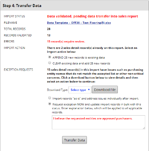 However, now at the bottom we have a new action to take for Exception Requests. If you wish, you can download the alerts feedback file and review it. Once you’re ready to move forward, you have two actions, Import records “as-is” which will require individual review when imported. You can also Request Exception NOW for the affected records, in bulk. If you choose to request exceptions, you must type in an exception request that will be applied to all the affected records. When complete, click Transfer Data.