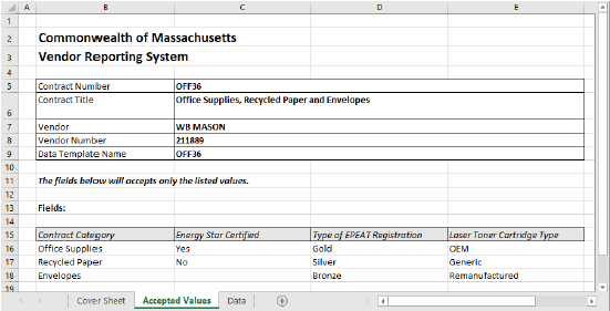 - Based on this example, we know the only Accepted Values for the field Contract Category is: Office Supplies, Recycled Paper, or Envelopes. All other values input for this column will result in an error on upload.