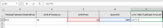 Use an Excel formula to easily validate Line Purchase Total Amount (e.g. =g2*f2)