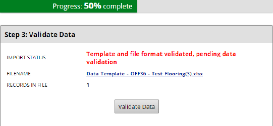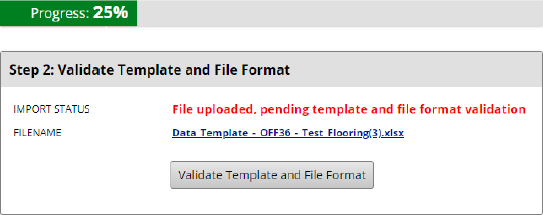2. The next step is to Validate Template and File Format. This ensures the system is getting what it’s expecting in terms of: Data Template (assigned to your report) and File Format (XLSX, XLS).
