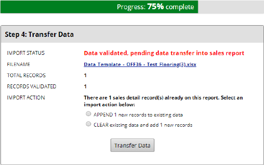 4. Lastly, the system recognizes we already have some sales data reported on this report. It wants to know whether we add to that data (APPEND) or overwrite that data (CLEAR) with the data we’re importing. Once we have made our choice, the final step is to Transfer Data.