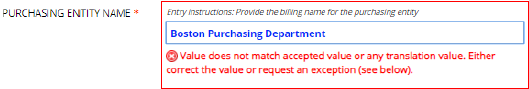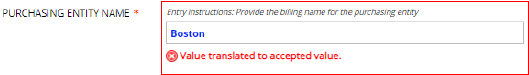 Another error you may see is that your Purchasing Entity Name doesn’t match anything in the accepted values list or match any translation to an accepted value.