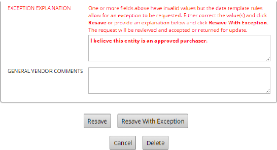 To fix this, what you will need to do is Request an Exception. If you’re insistent that the value you’ve input is correct, simply scroll down to the bottom of the record and input an Exception Explanation. Once you’ve done so at the bottom, click Resave with Exception.