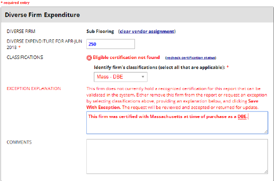 6. In the event the vendor you chose does not hold an eligible/recognized certification and you still want to count them toward your diverse expenditures. Then, you will be required to input an exception request for the diverse expenditure. This will include their assumed applicable classifications.