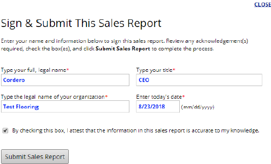 Once all the sales data and diverse expenditures have been completed, you will be able to return to the This Sales Report tab and click Submit Report. Type your name as a digital representation of your signature, your title, confirm the date and company name, and check the boxes of acknowledgment accordingly. Finally, click Submit Sales Report.