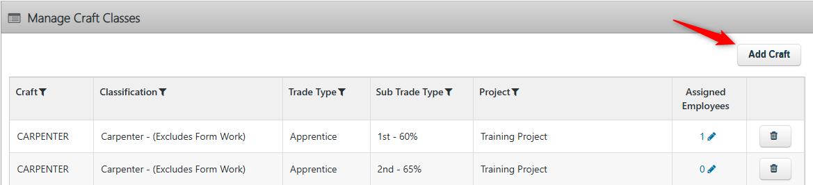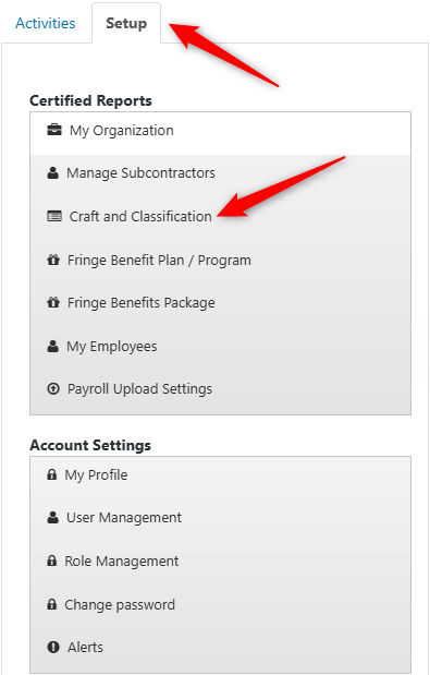 1. From the Getting Started section of the dashboard, click Click Here next to Step 4 Crafts and Classifications Added or from the Setup tab, select Craft and Classification under Certified Reports.