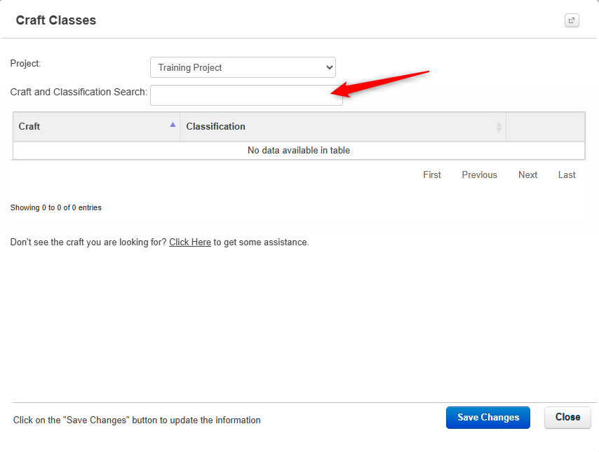 1. Type a craft or classification into the box next to Craft or Classification Search. If the craft you need does not appear, click the Click Here link for assistance.